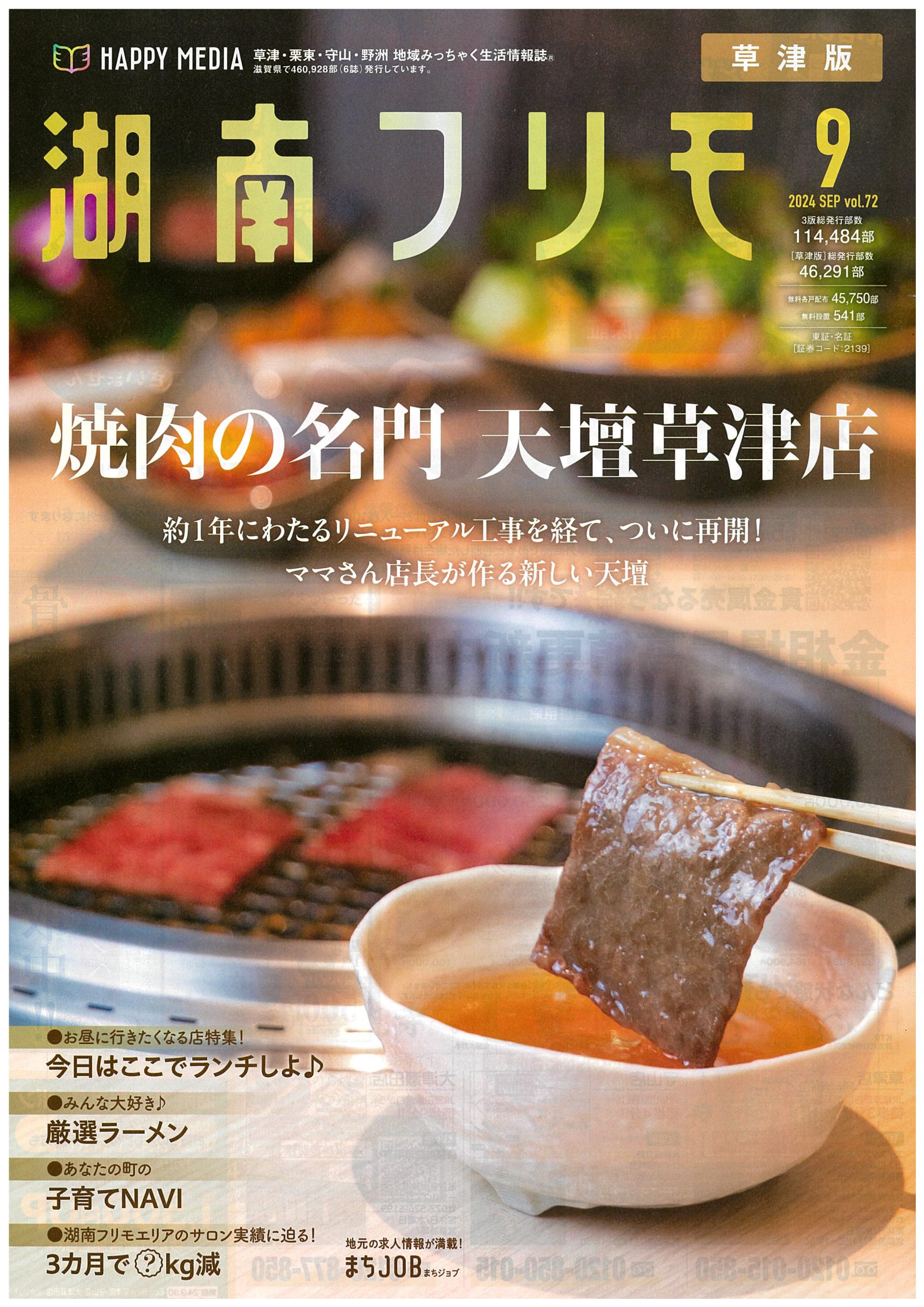 2024年8月26日発行の無料タウン情報誌「湖南フリモ9月号」にて天壇草津店をご紹介いただきました。