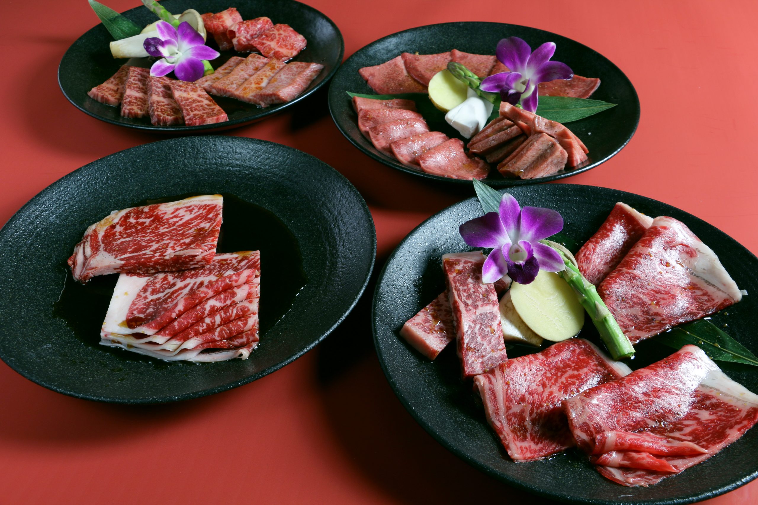 (ロース・厚切りロース・ミルフィーユロースを各60gずつ盛り合わせ)②カルビ3種盛合せ